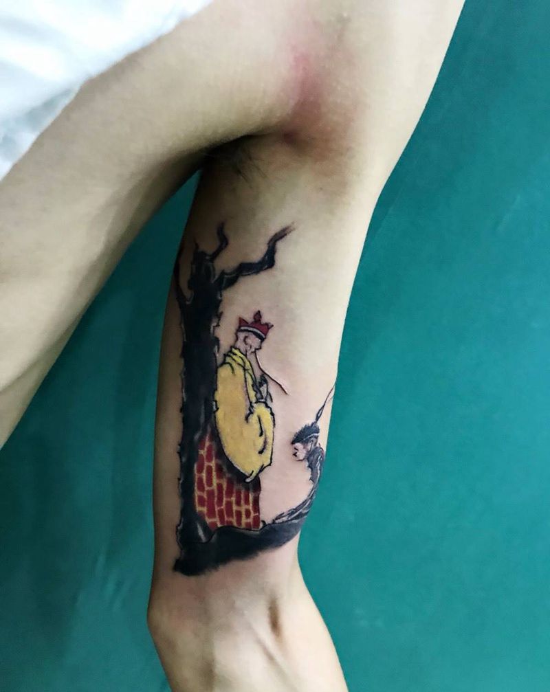 当前位置: 首页 >山东省烟台市纹身店-越世纹身纹身图案>毛笔画,遮盖作品纹身图片_成品手臂传统人物遮盖纹身图案