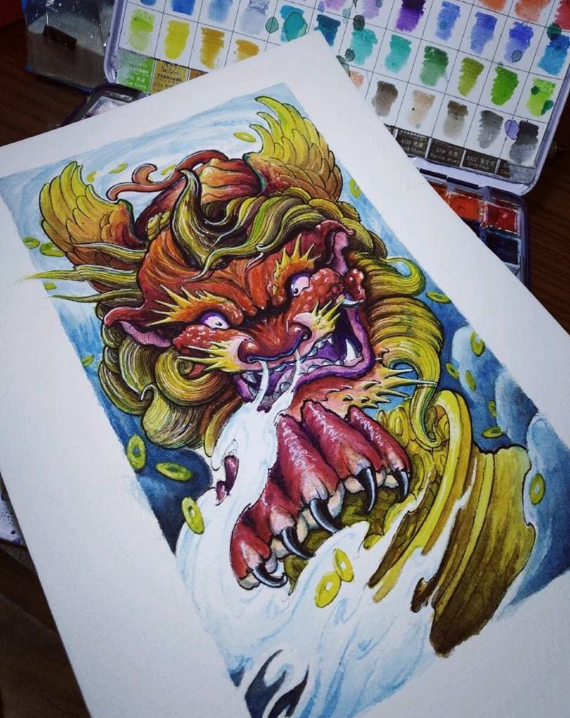 • T网红王老大花腿龙纹身图片_腿部新传统纹身图案