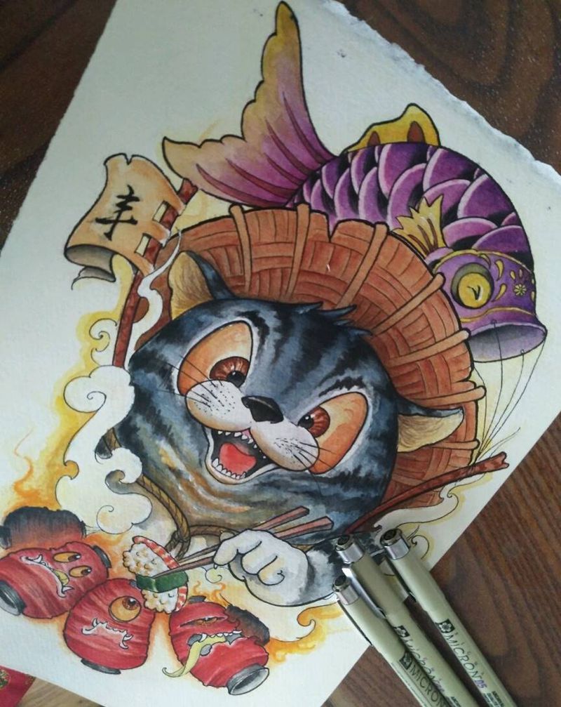 小猫吃寿司纹身图片_手稿插画纹身图案