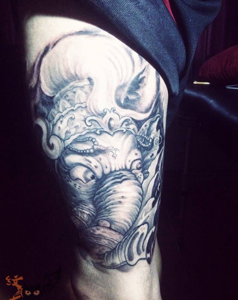 当前位置: 首页 >山东省东营市纹身店-丰刺青纹身图案>象神纹身图片_成品腿部传统宗教纹身图案