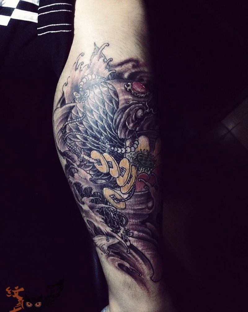 当前位置: 首页 >山东省东营市纹身店-丰刺青纹身图案>小腿鲤鱼纹身图片_成品腿部传统动物纹身图案