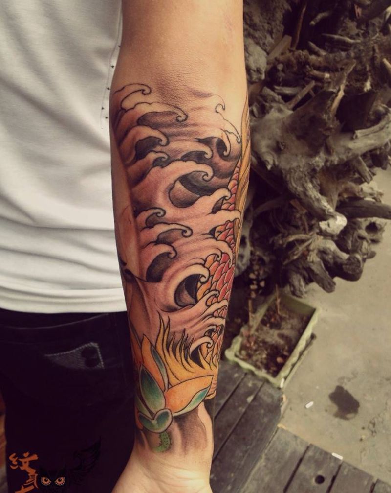 当前位置: 首页 >山东省东营市纹身店-丰刺青纹身图案>鲤鱼佛头纹身图片_成品手臂传统宗教动物植物纹身图案
