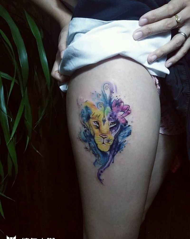 水彩狮子纹身图片_腿部欧美清新动物水彩成品纹身图案