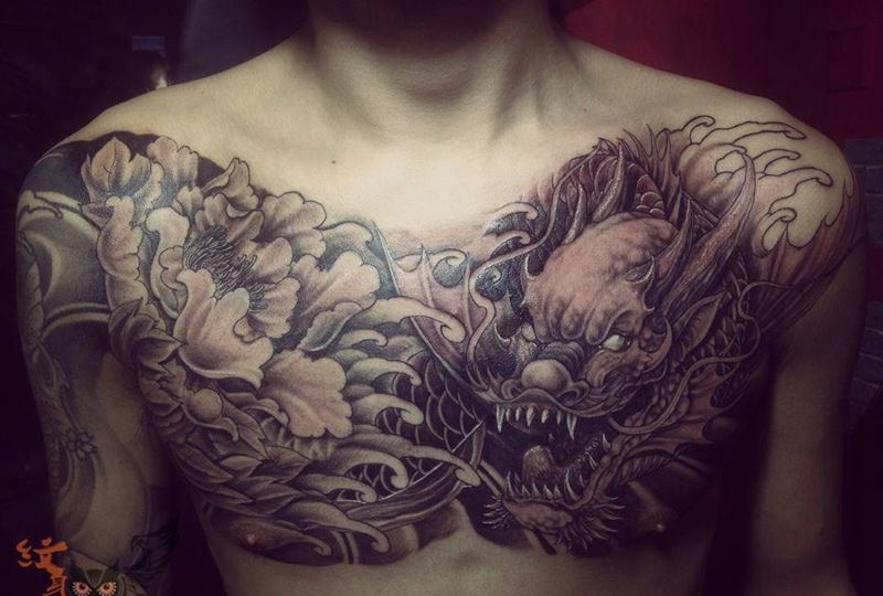 牡丹鳌鱼纹身图片_成品胸部传统动物植物鬼神纹身图案