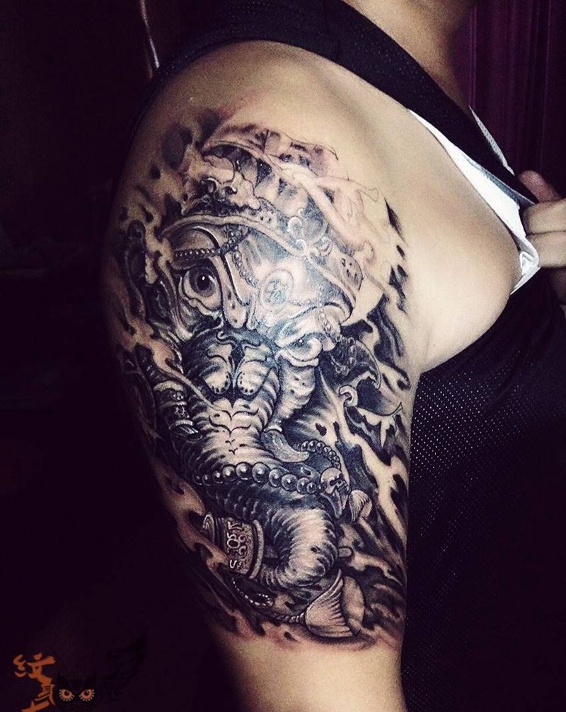 当前位置: 首页 >山东省东营市纹身店-丰刺青纹身图案>大臂象神纹身图片_成品肩部传统宗教动物纹身图案