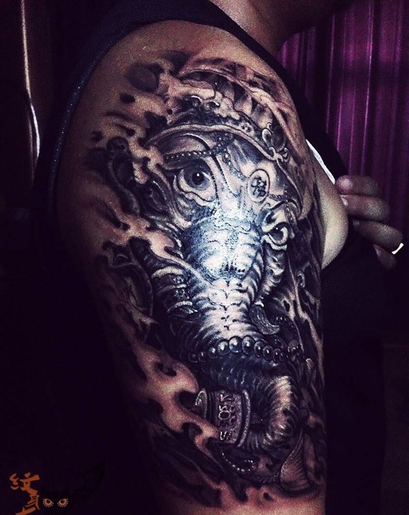 当前位置: 首页 >山东省东营市纹身店-丰刺青纹身图案>大臂象神纹身图片_成品肩部传统宗教动物纹身图案
