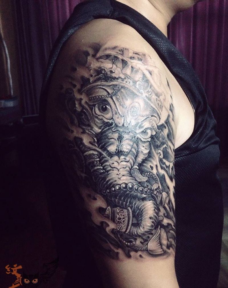 大臂象神纹身图片_成品肩部传统宗教动物纹身图案