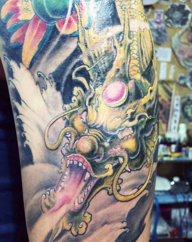 • T网红王老大花腿龙纹身图片_腿部新传统纹身图案
