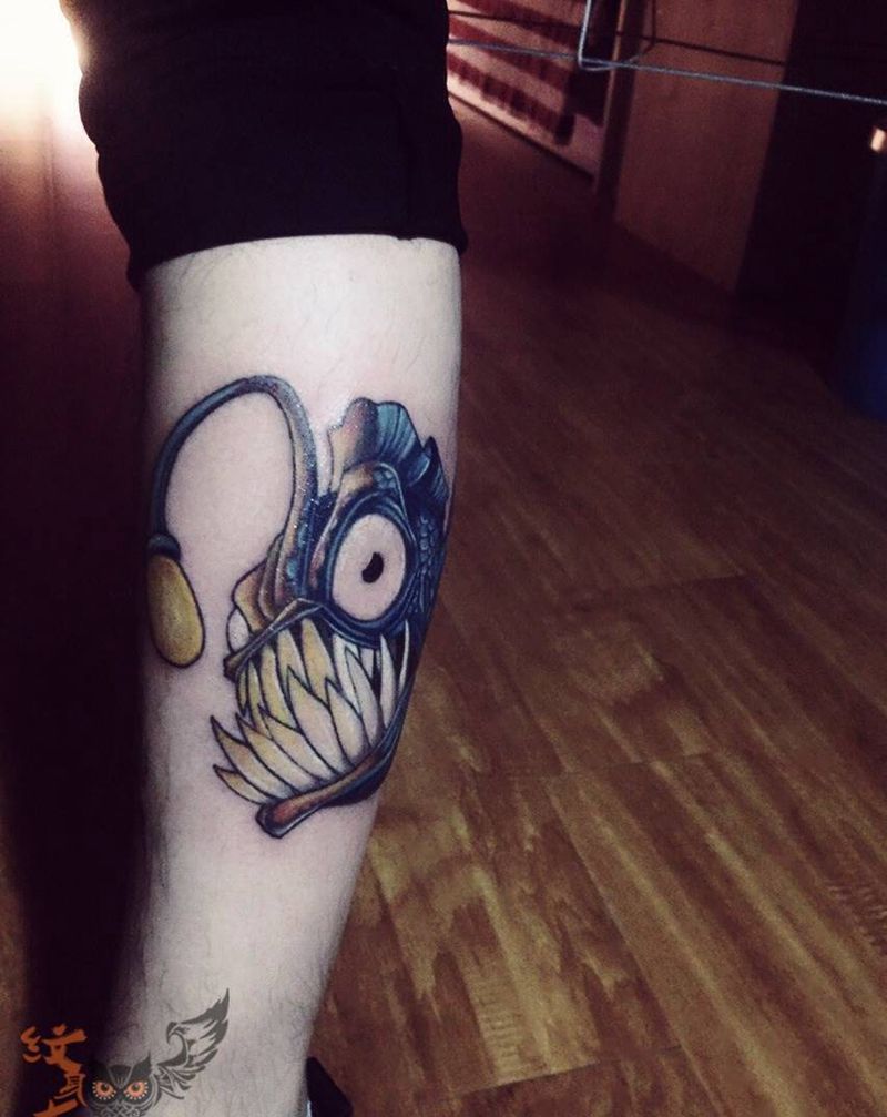 食人灯笼鱼纹身图片_成品腿部欧美动物纹身图案