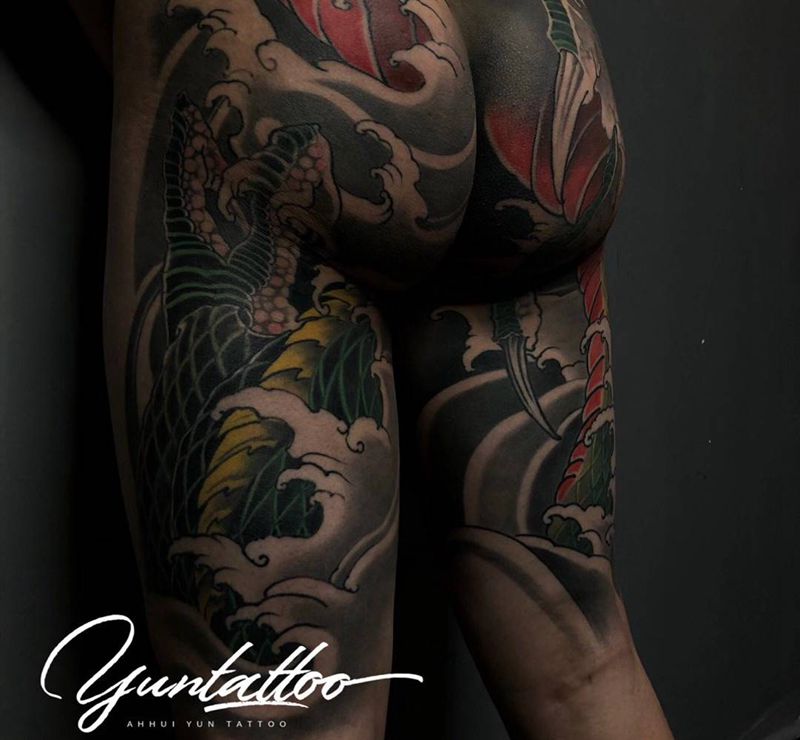• T网红王老大花腿龙纹身图片_腿部新传统纹身图案
