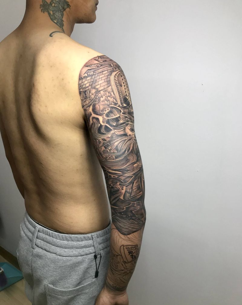 当前位置: 首页 >山东省烟台市纹身店-鼎力刺青专业纹身会所纹身图案>DL花臂未完成纹身图片_手臂老传统纹身图案