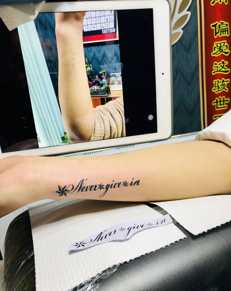 当前位置: 首页 >山东省烟台市纹身店-鼎力刺青专业纹身会所纹身图案>DL 手臂旧图英文遮盖纹身图片_手臂老传统纹身图案