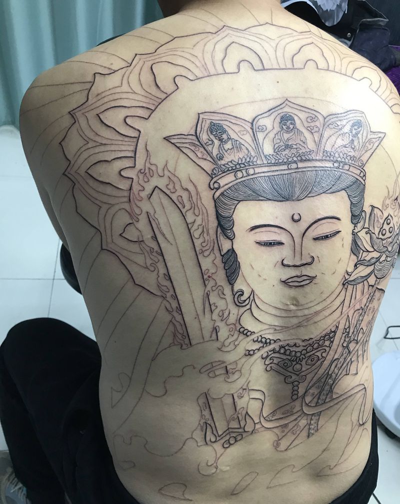 当前位置: 首页 >山东省烟台市纹身店-鼎力刺青专业纹身会所纹身图案>DL满背虚空藏线条纹身图片_背部老传统纹身图案