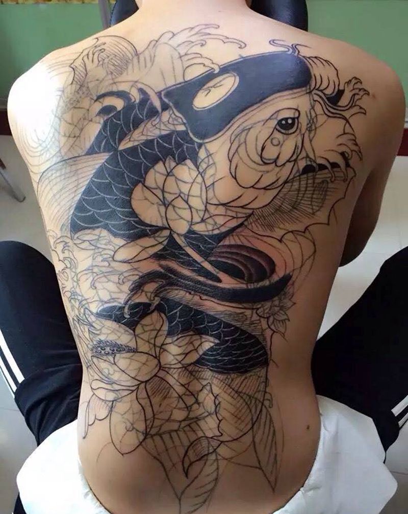 满背锦鲤遮盖纹身图片_背部动物传统纹身图案