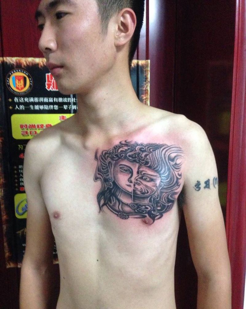 当前位置: 首页 >山东省烟台市纹身店-鼎力刺青专业纹身会所纹身图案>小花胸善恶一瞬间纹身图片_成品胸部传统鬼神纹身图案
