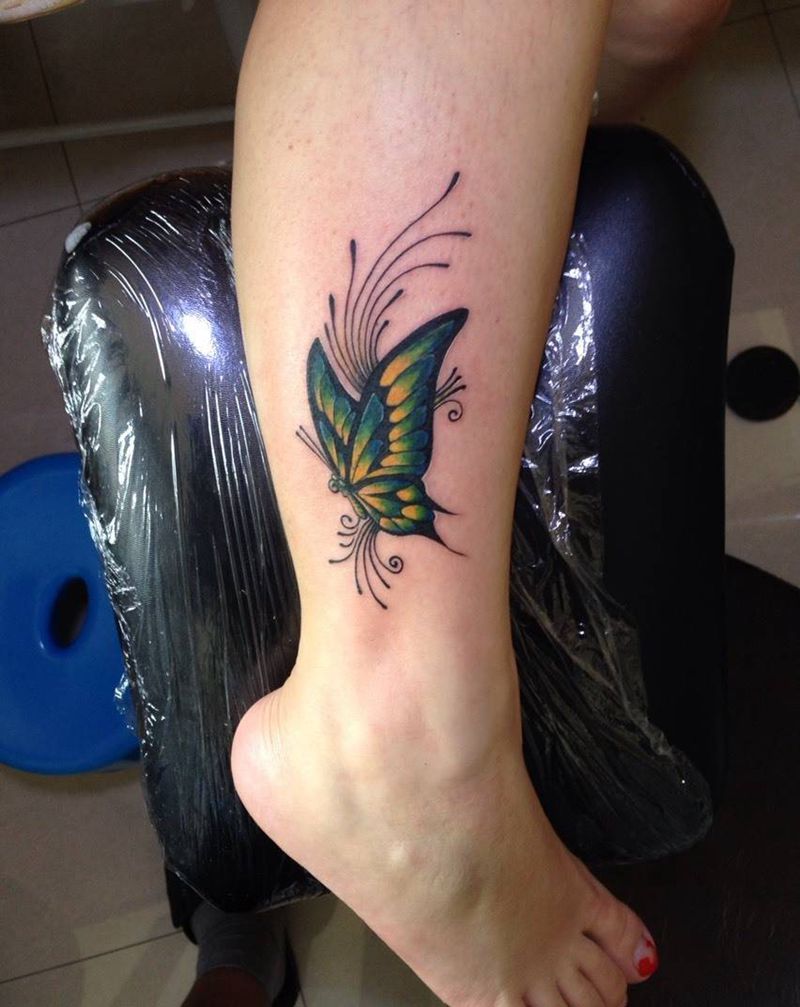 脚踝彩蝶纹身图片_成品腿部写实动物纹身图案