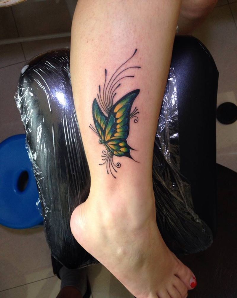 当前位置: 首页 >山东省烟台市纹身店-鼎力刺青专业纹身会所纹身图案>脚踝彩蝶纹身图片_成品腿部写实动物纹身图案