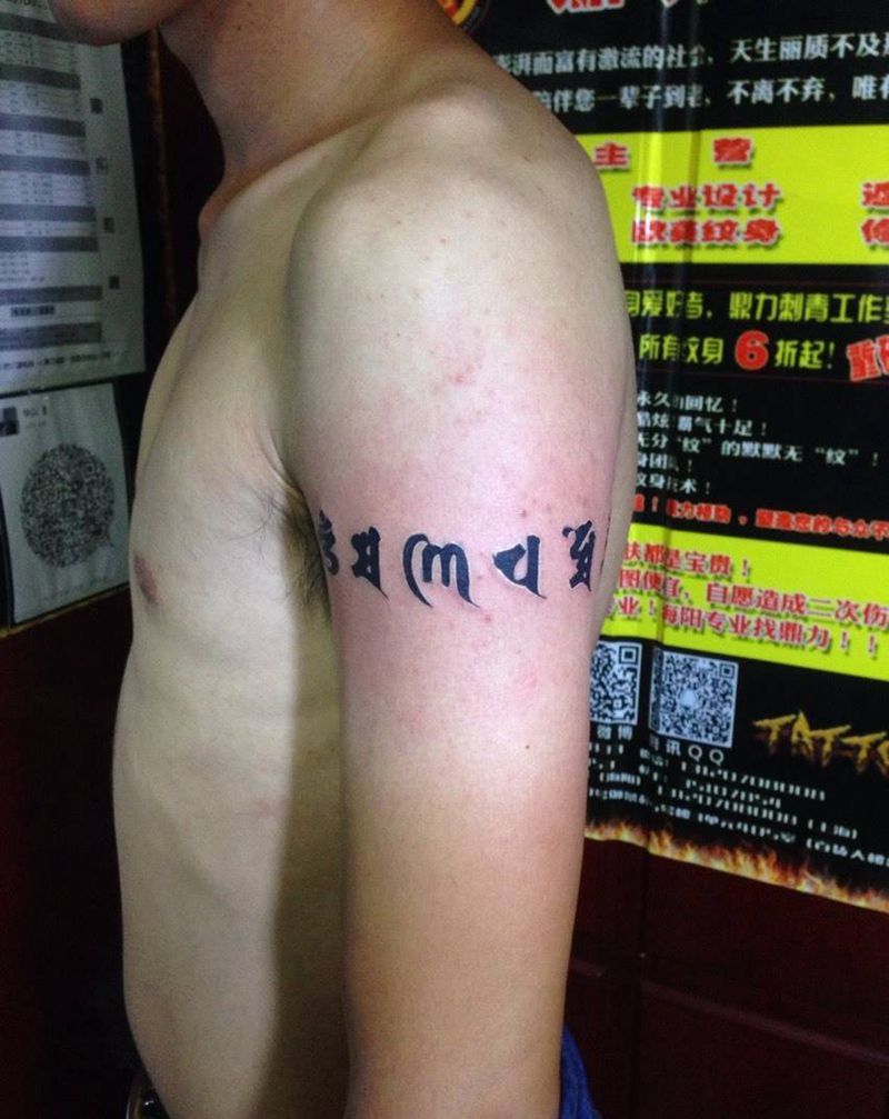 当前位置: 首页 >山东省烟台市纹身店-鼎力刺青专业纹身会所纹身图案>大臂六字大明咒纹身图片_手臂传统字符纹身图案