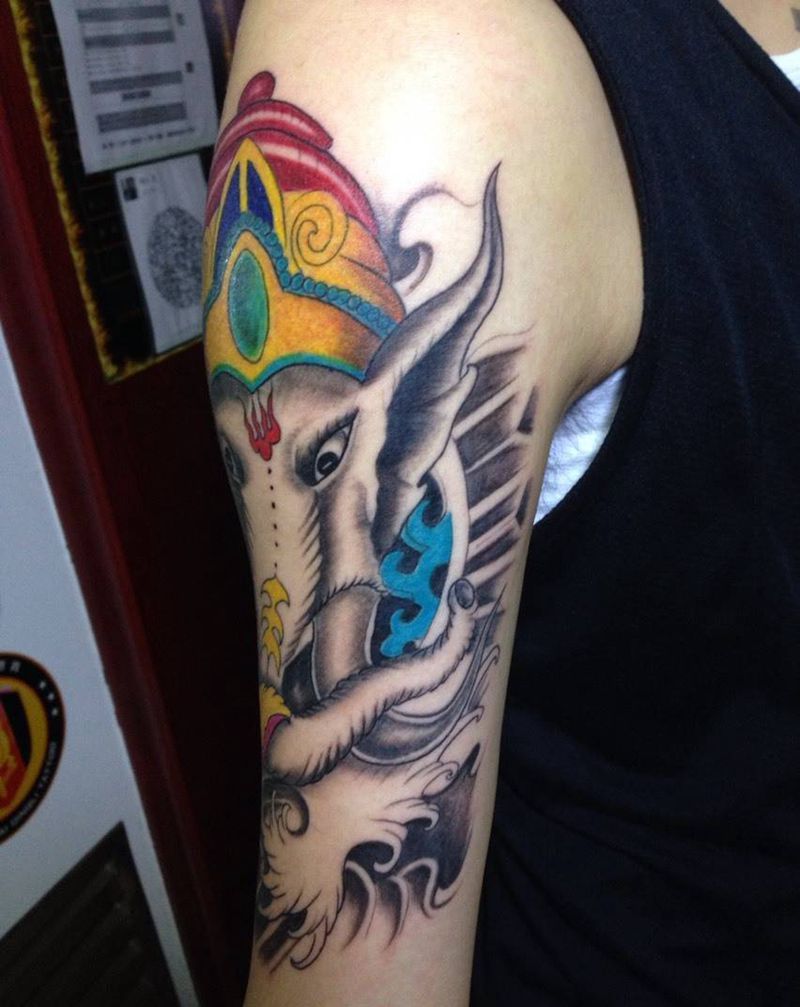 当前位置: 首页 >山东省烟台市纹身店-鼎力刺青专业纹身会所纹身图案>大臂象神纹身图片_手臂传统动物纹身图案