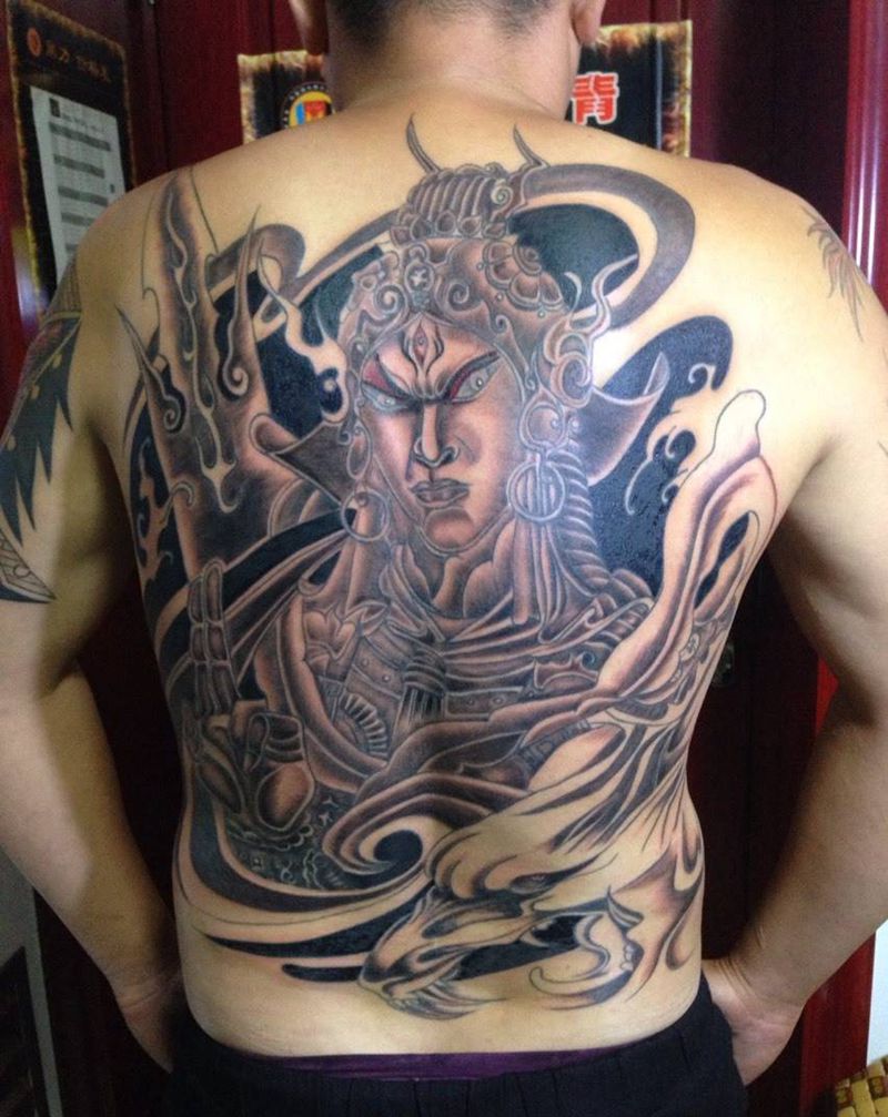 满背二郎神纹身图片_成品背部传统人物纹身图案