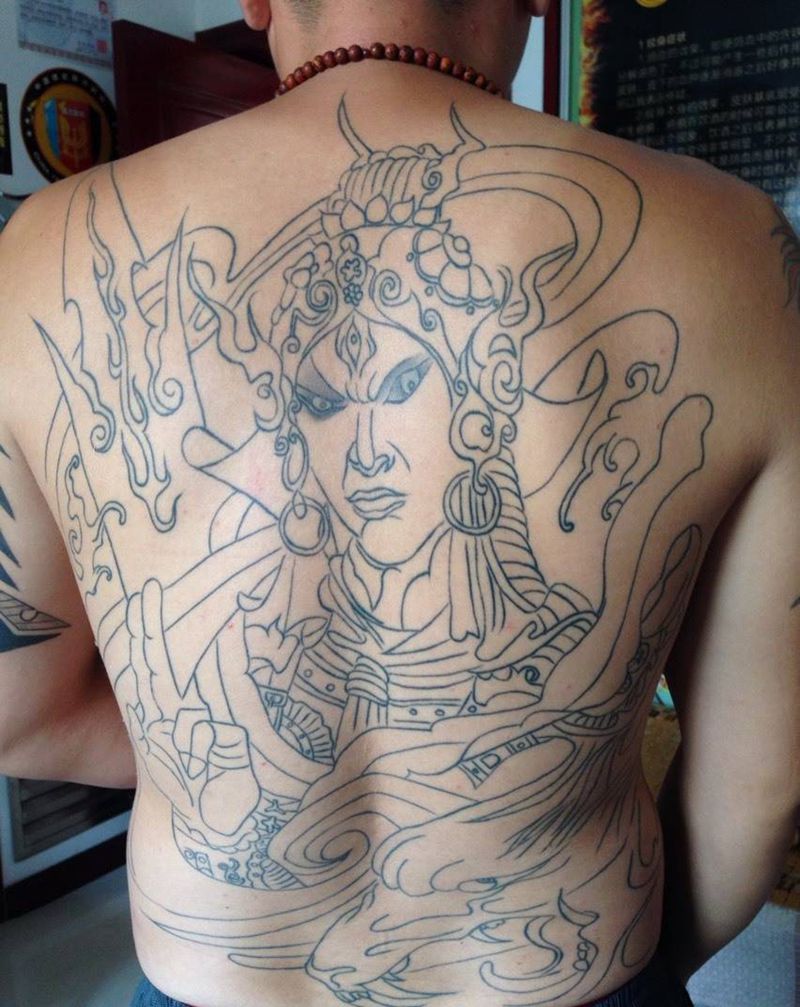 满背二郎神纹身图片_成品背部传统人物纹身图案