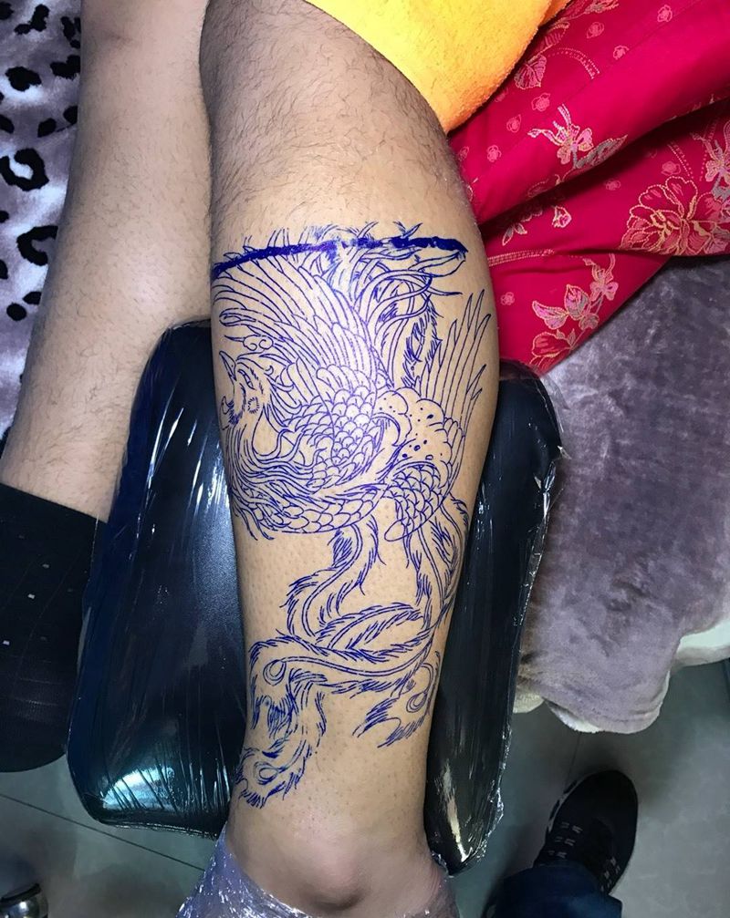 ༺小͈̎腿͈̎外͈̎侧͈̎彩͈̎凤͈̎༻纹身图片_腿部传统动物纹身图案