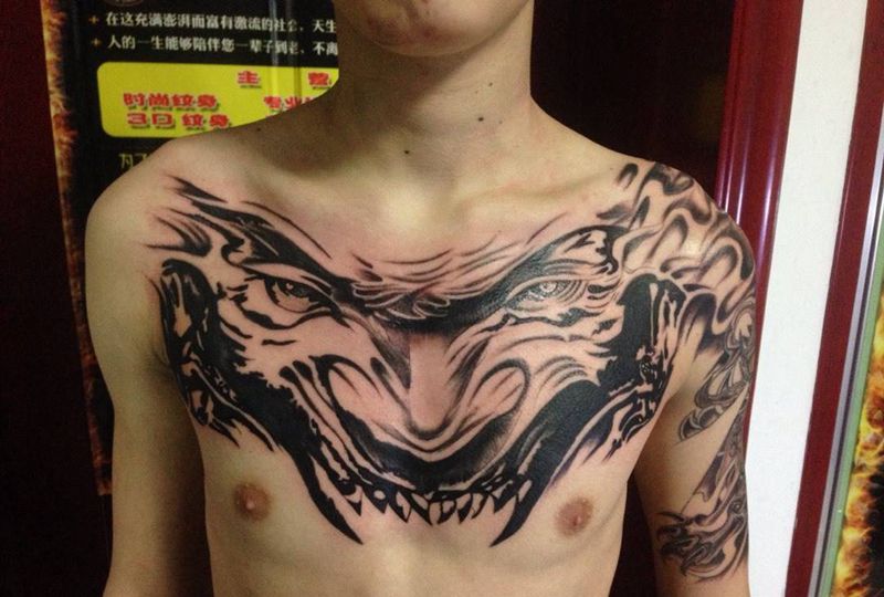 当前位置: 首页 >山东省烟台市纹身店-鼎力刺青专业纹身会所纹身图案>大花胸鬼首纹身图片_成品胸部肖像鬼神纹身图案