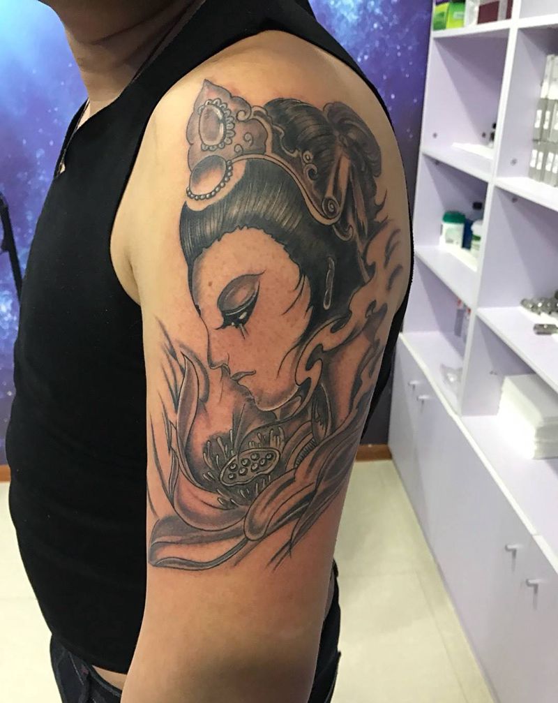 当前位置: 首页 >山东省烟台市纹身店-鼎力刺青专业纹身会所纹身图案>大臂艺姬纹身图片_成品手臂传统人物纹身图案