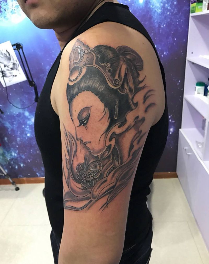 当前位置: 首页 >山东省烟台市纹身店-鼎力刺青专业纹身会所纹身图案>大臂艺姬纹身图片_成品手臂传统人物纹身图案