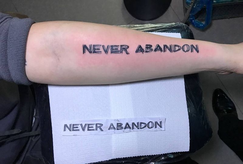 当前位置: 首页 >山东省烟台市纹身店-鼎力刺青专业纹身会所纹身图案>小臂英文控纹身图片_成品手臂传统字符纹身图案