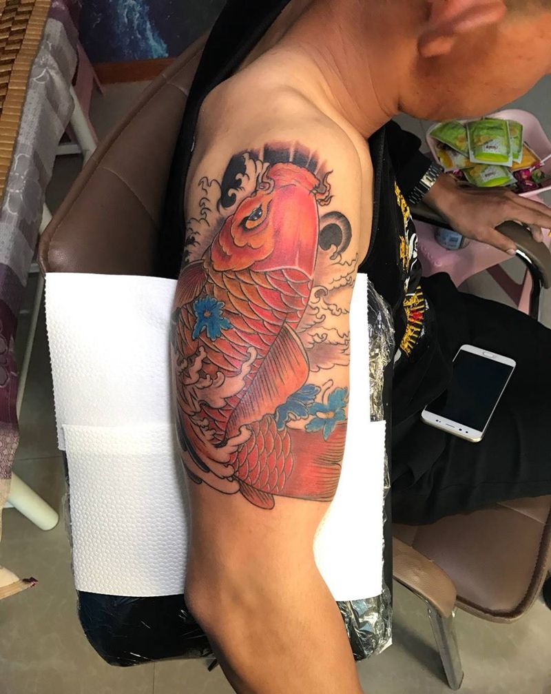 当前位置: 首页 >山东省烟台市纹身店-鼎力刺青专业纹身会所纹身图案>大臂彩色招财锦鲤纹身图片