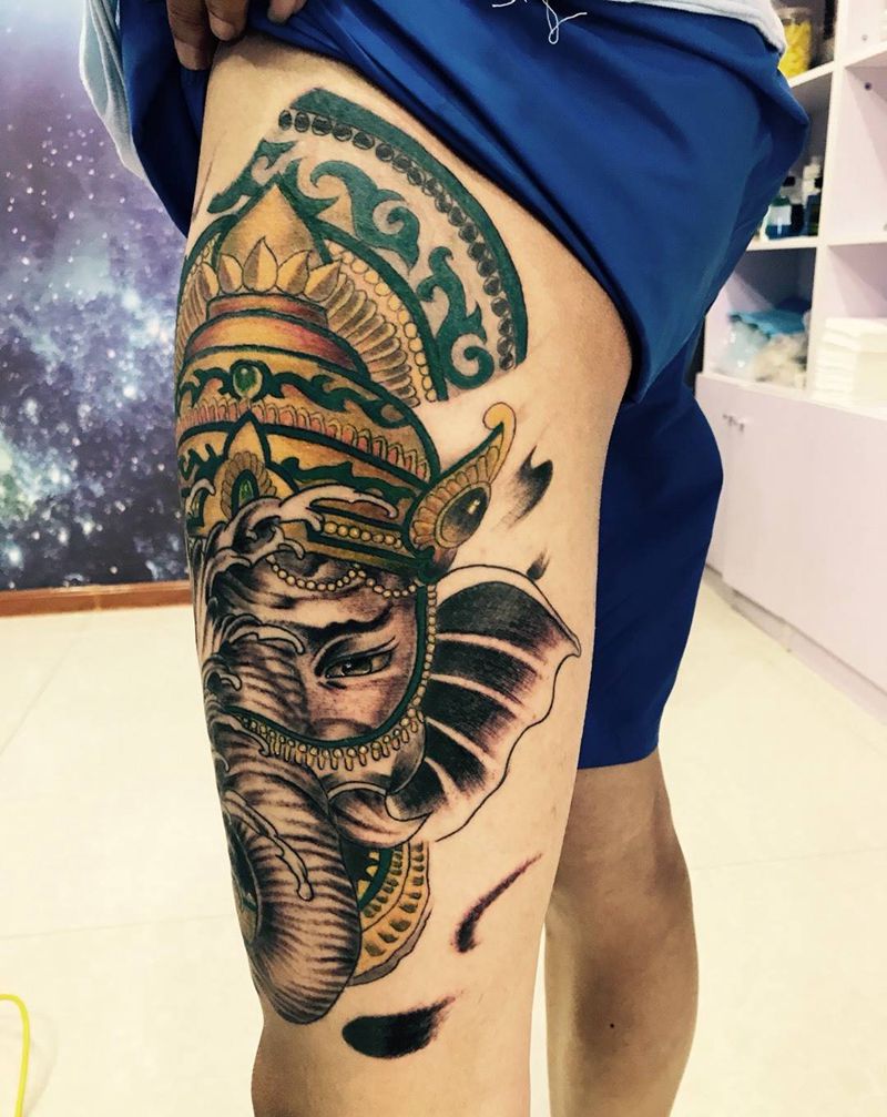 当前位置: 首页 >山东省烟台市纹身店-鼎力刺青专业纹身会所纹身图案>大腿象神纹身图片