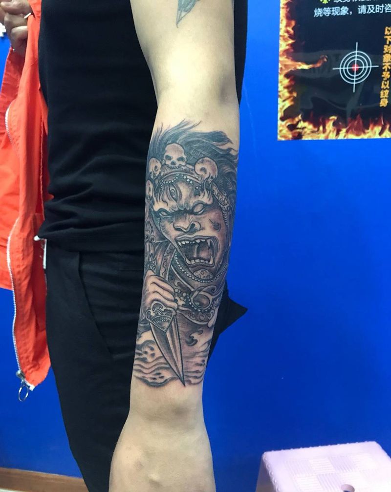 当前位置: 首页 >山东省烟台市纹身店-鼎力刺青专业纹身会所纹身图案>小臂大黑天纹身图片