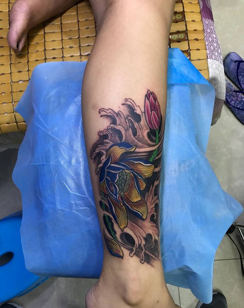 小腿外侧彩莲纹身图片