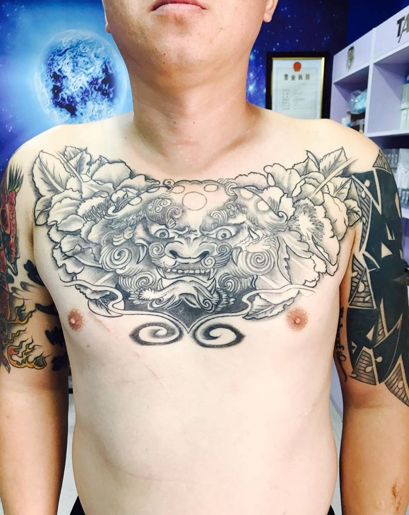 当前位置: 首页 >山东省烟台市纹身店-鼎力刺青专业纹身会所纹身图案>花胸唐狮纹身图片
