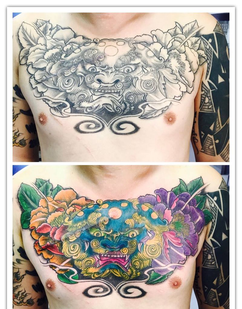 当前位置: 首页 >山东省烟台市纹身店-鼎力刺青专业纹身会所纹身图案>花胸唐狮纹身图片