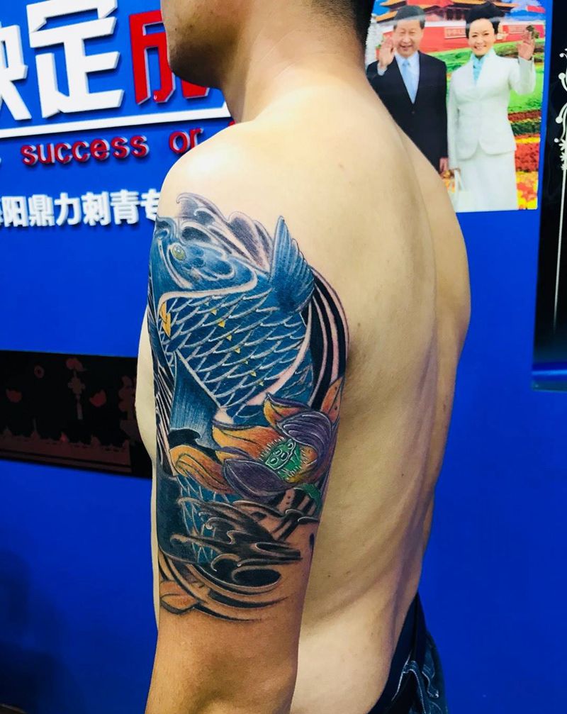 当前位置: 首页 >山东省烟台市纹身店-鼎力刺青专业纹身会所纹身图案>大臂彩色招财锦鲤纹身图片