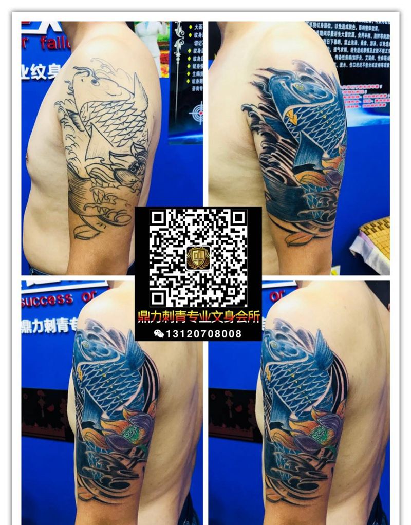 当前位置: 首页 >山东省烟台市纹身店-鼎力刺青专业纹身会所纹身图案>大臂彩色招财锦鲤纹身图片