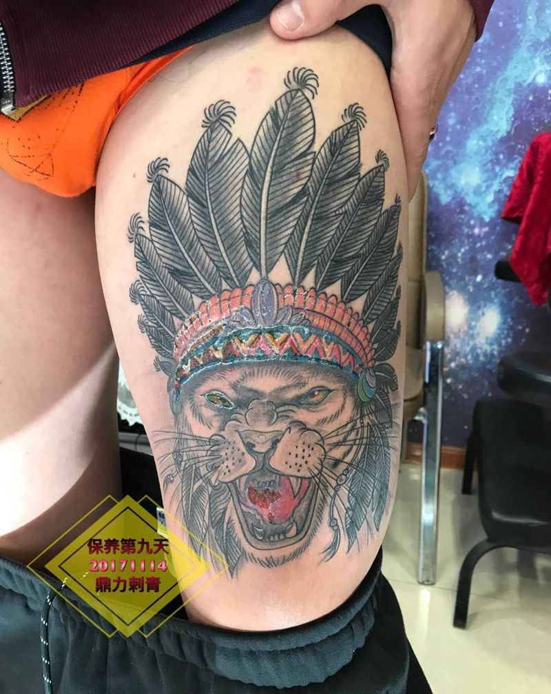 当前位置: 首页 >山东省烟台市纹身店-鼎力刺青专业纹身会所纹身图案>大腿印第安狮子纹身图片