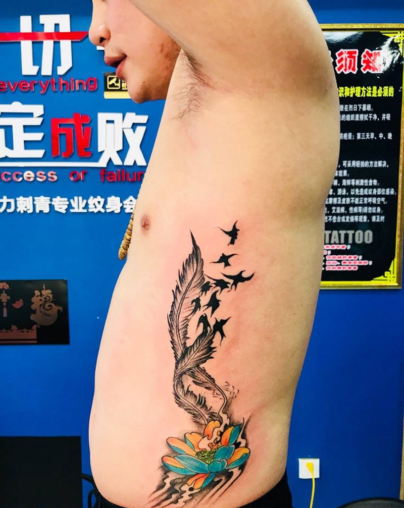 当前位置: 首页 >山东省烟台市纹身店-鼎力刺青专业纹身会所纹身图案>侧肋羽飞燕恋荷纹身图片_成品腰部传统静物植物纹身图案