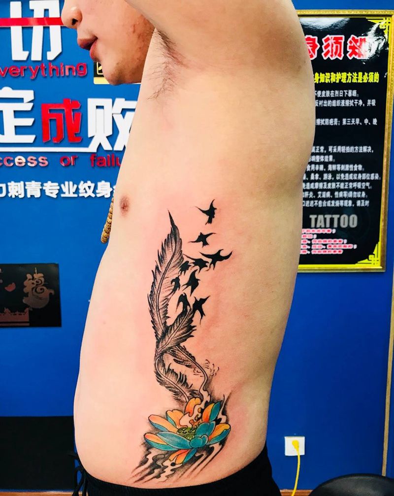 当前位置: 首页 >山东省烟台市纹身店-鼎力刺青专业纹身会所纹身图案>侧肋羽飞燕恋荷纹身图片_成品腰部传统静物植物纹身图案