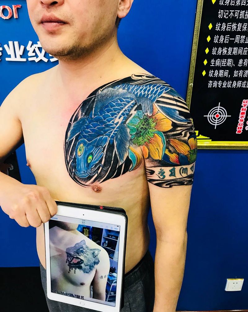 当前位置: 首页 >山东省烟台市纹身店-鼎力刺青专业纹身会所纹身图案>半甲锦鲤纹身图片