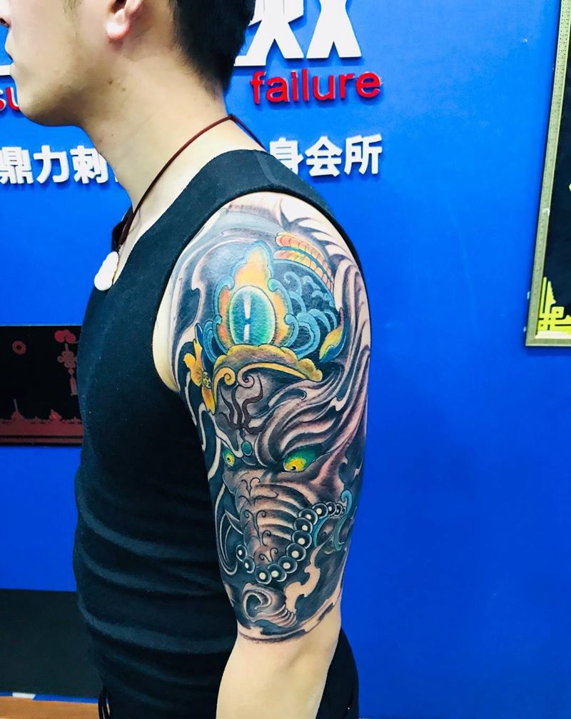当前位置: 首页 >山东省烟台市纹身店-鼎力刺青专业纹身会所纹身图案>大臂象神修改纹身图片