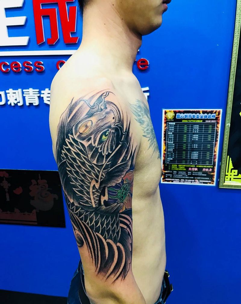 当前位置: 首页 >山东省烟台市纹身店-鼎力刺青专业纹身会所纹身图案>大臂锦鲤纹身图片