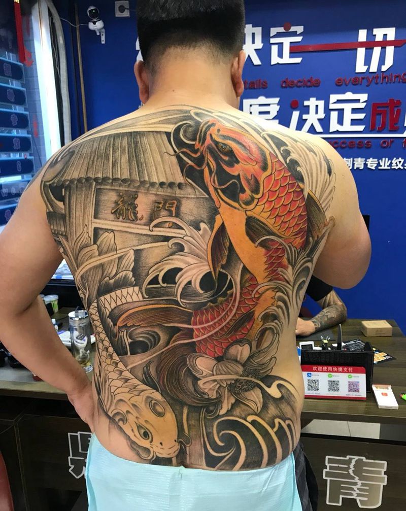 当前位置: 首页 >山东省烟台市纹身店-鼎力刺青专业纹身会所纹身图案>满背鲤鱼跳龙门纹身图片