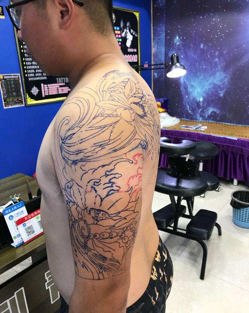 当前位置: 首页 >山东省烟台市纹身店-鼎力刺青专业纹身会所纹身图案>后背大臂锦鲤荷花纹身图片