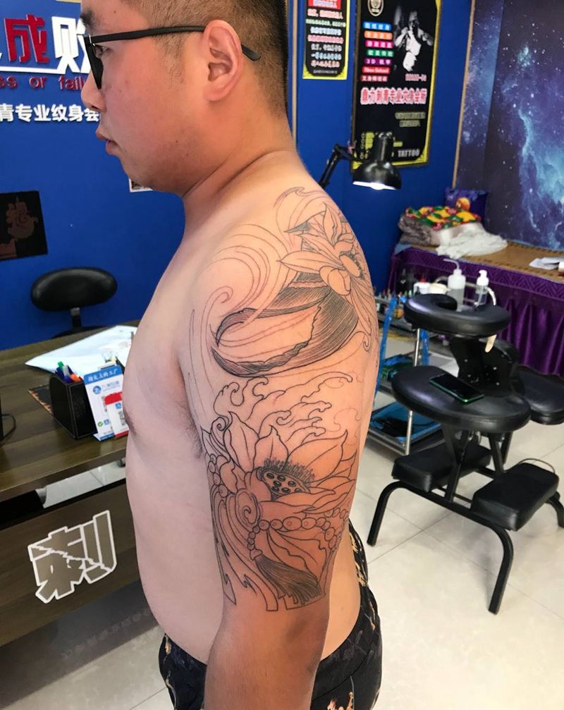 当前位置: 首页 >山东省烟台市纹身店-鼎力刺青专业纹身会所纹身图案>后背大臂锦鲤荷花纹身图片