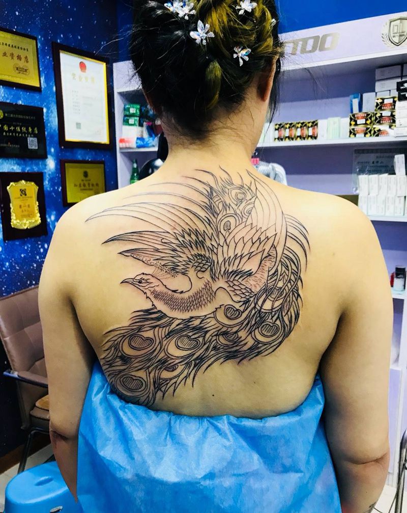 当前位置: 首页 >山东省烟台市纹身店-鼎力刺青专业纹身会所纹身图案>后背彩色孔雀纹身图片