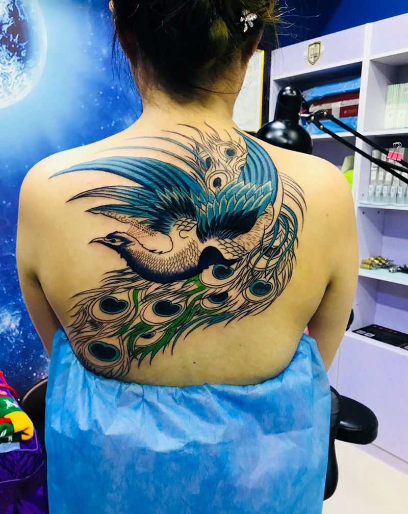 当前位置: 首页 >山东省烟台市纹身店-鼎力刺青专业纹身会所纹身图案>后背彩色孔雀纹身图片