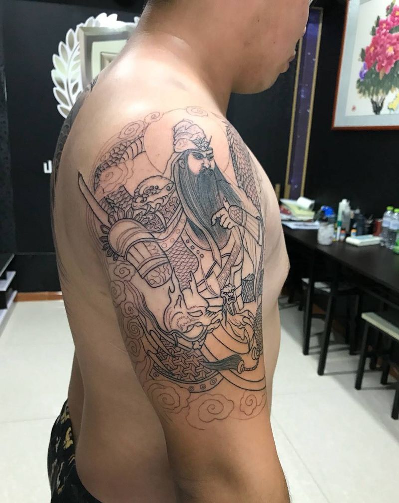 当前位置: 首页 >山东省烟台市纹身店-鼎力刺青专业纹身会所纹身图案>大臂关公踏龙纹身图片
